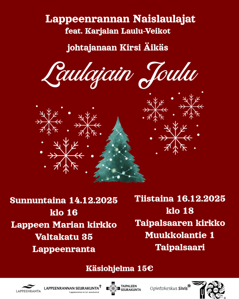 Lämpimästi tervetuloa Laulajain joulu -joulukonsertteihimme Lappeenrantaan ja Taipalsaarelle!